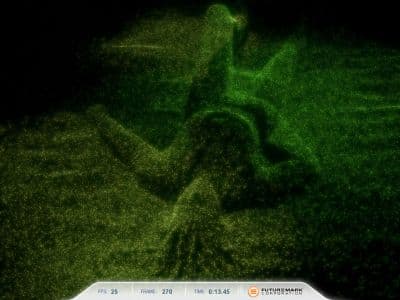 Тест физической симуляции эффектов на базе систем частиц, рассчитываемых при помощи видеочипа. Также используется вершинная симуляция, каждая вершина представляет одиночную частицу. Stream out используется с той же целью, что и в предыдущем тесте. Рассчитывается несколько сотен тысяч частиц, все анимируются отдельно, также рассчитываются их столкновения с картой высот. Аналогично одному из тестов нашего RightMark3D 2.0, частицы отрисовываются при помощи геометрического шейдера, который из каждой точки создает четыре вершины, образующих частицу. Но тест больше всего загружает шейдерные блоки вершинными расчётами, также тестируется stream out.