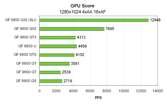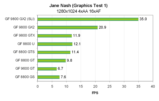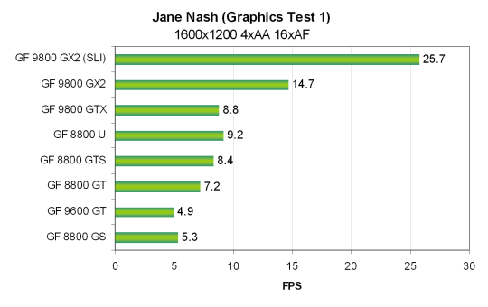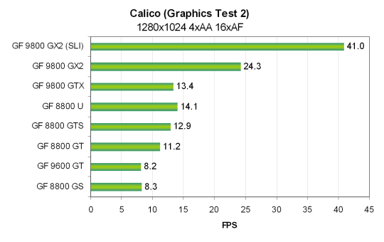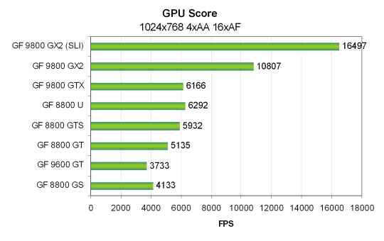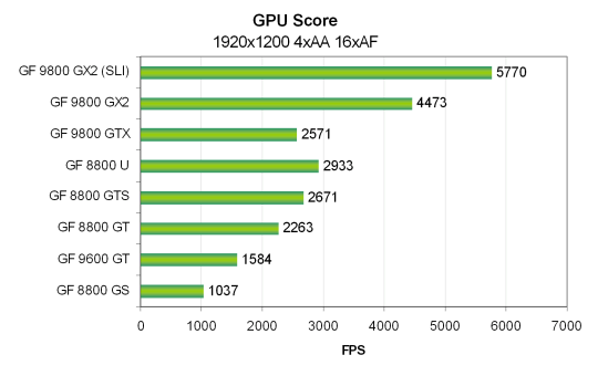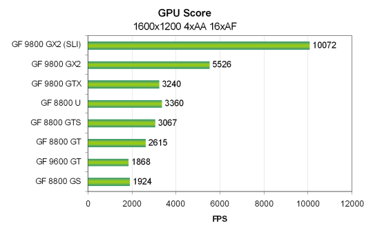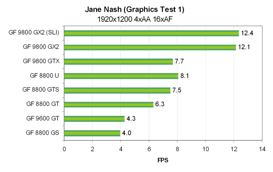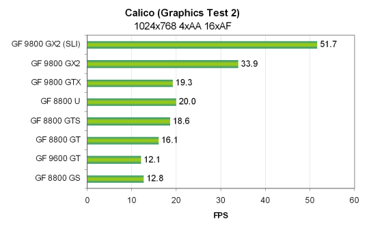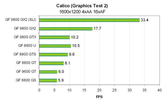 Для SLI системы на основе двух видеокарт Nvidia Geforce 9800 GX2 была использована та же система, только на основе системной платы Zotac nForce 790i Ultra SLI и 2 GB DDR3 памяти, работающей на частоте 2000 MHz. Все тесты Vantage проводились в режиме настроек Extreme. Использовались разрешения от 1024x768 до 1920x1200 включительно, также и с включенными мультисэмплингом с четырьмя выборками (MSAA 4x) и анизотропной фильтрацией максимально возможного уровня — 16x. Все возможности включались из настроек теста, в конфигурационной панели видеодрайверов ничего не изменялось.