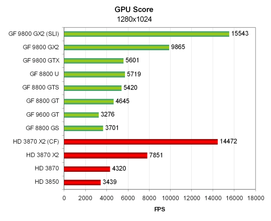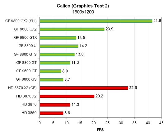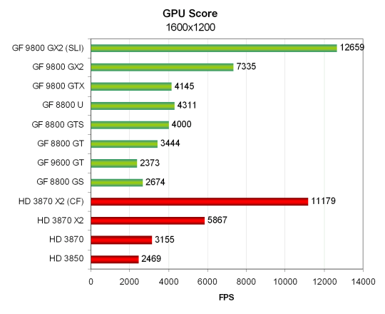 В остальном, всё как обычно — карты AMD отстают от своих конкурентов, только RADEON HD 3850 показывает результат на уровне Geforce 9600 GT. Двухчиповый HD 3870 X2 не слишком сильно обгоняет одночиповый топ конкурента, а 9800 GX2 получает почти двукратное преимущество в скорости, по сравнению с 8800 GTS. В общем, если не обращать внимания на такие большие цифры, то тест использовать можно, соотношение скоростей у разных видеокарт он показывает правильно.