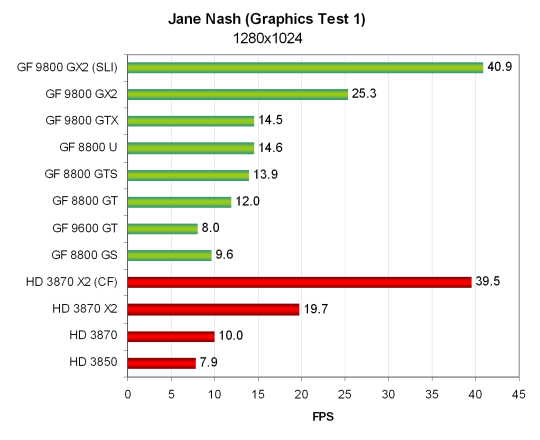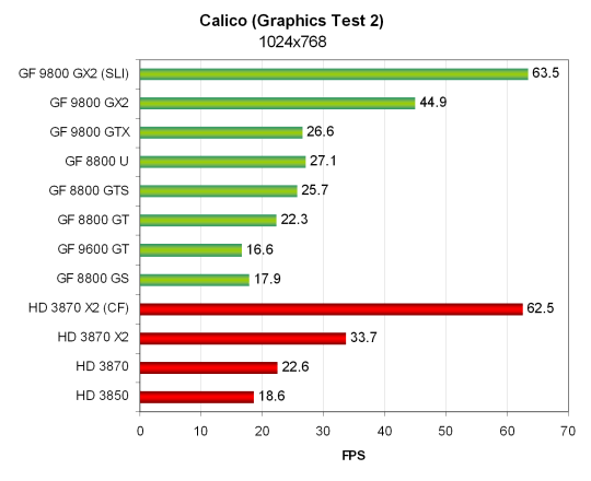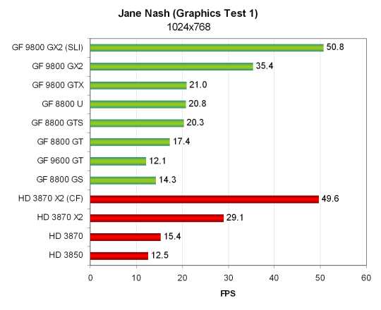 Но нет, ничего особенно нового. Хотя видеокарты AMD во втором тесте смотрятся чуть получше, чем в первом. HD 3870 показывает результат на уровне 8800 GT, а HD 3850 весьма успешно соперничает с 9600 GT и 8800 GS.