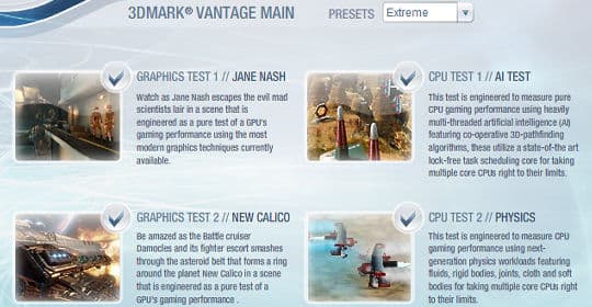 Одно из наиболее важных нововведений в 3DMark Vantage — наборы предустановок (preset). Это комбинации настроек теста, таких как разрешение, уровень антиалиасинга, текстурной фильтрации и т.п., предназначенные для видеокарт разного уровня, от интегрированных до топовых, с разной нагрузкой на видеочип. При запуске определенного набора настроек, в итоге выдаётся цифра количества очков для этого конкретного набора. В прошлых версиях 3DMark был единственный набор — настройки по умолчанию, а теперь есть Entry, Performance, High и Extreme.