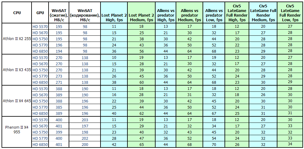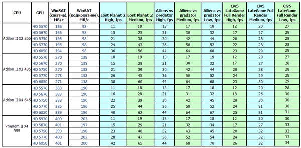 Как видите, разница не так чтобы очень бросается в глаза, вполне можно играть и со средними настройками качества, то есть видеокарта уровня Radeon HD5770 обеспечивает комфорт с запасом. Поиграть с максимальным качеством и приемлемой скоростью получится, имея в своем арсенале Radeon HD6850, и, кстати, в тестах с этой видеокартой начинает проявляться зависимость от центрального процессора, в остальных она несущественна. Но и для этой видеокарты не обязательно приобретать самый мощный из нашего списка, более чем достаточно взять Athlon II X4 645, да и трехъядерник в случае ограниченного бюджета вполне сойдет.