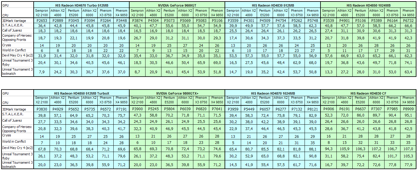 Если посмотреть на относительные соотношения, то для младшей видеокарты замена самого слабого процессора на самый мощный дает прирост лишь в 1,3 раза, тогда как для Radeon HD4830 аналогичная перестановка дает прирост уже в 1,6 раза, а для старшей карты — прирост двукратный. Однако в целом, глядя на рейтинги в этом тесте, нельзя однозначно сказать, для какой карты какой процессор оптимален (это покажут игры). Но, ориентируясь по абсолютной величине, с учетом, что нами были форсированы настройки AA и AF, можно сказать, что варианты с оценкой выше 3000 соответствуют потребностям массовых игр, а такой результат набирает даже Radeon HD4670 в комплекте со средним процессором, а остальные карты даже в паре с Athlon X2 4800 набирают выше 4000.