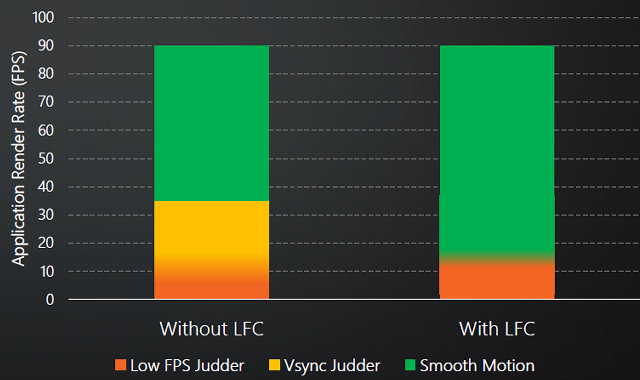 Специальный адаптивный алгоритм автоматически изменяет последовательность выходных кадров и их частоту обновления так, чтобы снизить неприятные рывки из-за падения частоты кадров. При FPS ниже минимальной частоты обновления и включенной вертикальной синхронизации (VSync on) FreeSync ранее вовсе не работал, что вызывало неплавность в смене кадров. Но теперь, с включением LFC, смена кадров в таком случае плавная. При отключенной синхронизации в тех же условиях наблюдаются разрывы кадра (так называемый tearing), но включение LFC снижает и их.