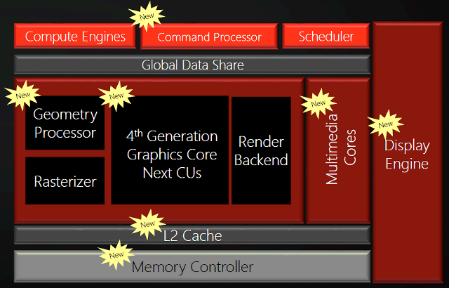 Пока что компания AMD по понятным причинам не раскрывает каких-либо подробностей обо всех этих улучшениях, приводя лишь схематичный слайд о тех аппаратных блоках, которые изменятся в графических процессорах архитектуры Polaris: