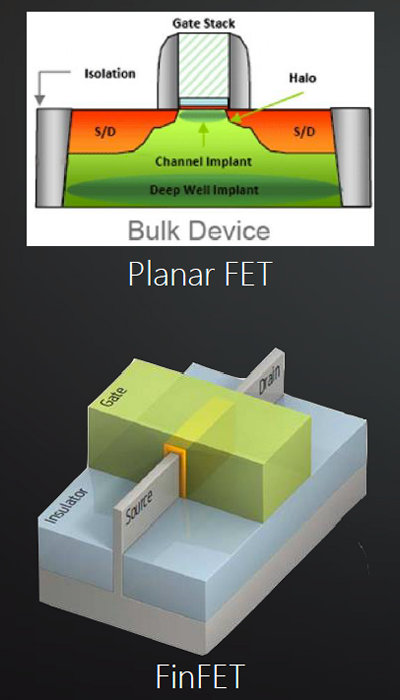 Архитектура Polaris изначально разрабатывалась под возможности FinFET-техпроцессов, и должна использовать все их возможности, позволяющие достичь технологических норм в 16 нм и ниже. Для понимания разницы между различными технологиями приведём иллюстрацию, на которой схематично изображены планарный транзистор и FinFET: