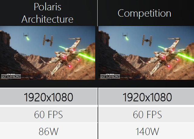Есть некоторые предположения, что одними из самых важных первых графических процессоров архитектуры Polaris будут именно такие чипы — не топовые, а средней мощности, но весьма энергоэффективные и ориентированные на подобные устройства: лёгкие игровые ноутбуки и компактные игровые ПК. Тем более, что производители ноутбуков уже выбирают поставщиков GPU для моделей, запланированных на конец 2016 года и даже на 2017 год. Неудивительно, что именно такой GPU и был продемонстрирован на мероприятии — когда в игре Star Wars Battlefront сравнивался один из GPU архитектуры Polaris и весьма энергоэффективная видеокарта GeForce GTX 950 от NVIDIA:
