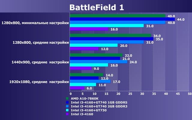 Итак, лишь на минимальных настройках и в низких разрешениях можно сносно играть в Battlefield 1 на трех из пяти наших бюджетных вариантов. Разрешения Full HD и даже 1440×900 при средних настройках качества можно исключить из рассмотрения. В целом лучше прочих выглядит вариант Intel i3-4160 + GT 740 с GDDR5, а AMD A10-7860K оказывается чуть медленнее, однако если посмотреть на стоимость платформ и разных вариантов комплектации, то платформа AMD с учетом цены выглядит гораздо предпочтительнее, поскольку ее отставание по производительности не слишком велико, а вот стоимость гораздо ниже. В целом, бюджетные решения, вроде рассмотренных в обзоре, не подходят для игры Battlefield 1 (если не снижать разрешение ниже 1280×800, однако при этом качество картинки станет совсем уж плачевным из-за сильного алиасинга).