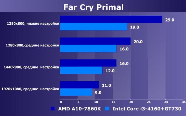 Этот цикл материалов посвящен тестированию современных популярных игр на платформах бюджетного уровня с интегрированной и дискретной графикой низшего ценового диапазона. Целью данного исследования является демонстрация читателям готовности или неготовности популярных из-за ценовой доступности конфигураций для использования в качестве игровых платформ нетребовательными игроками. Особо подчеркнем, что цикл ориентирован на покупателей готовых решений в виде офисных и дешевых домашних ПК и предлагает мало полезной информации для тех, кто желает обновить свой ПК (сделать апгрейд). Сегодня в качестве предмета исследований мы взяли очень новейшую и очень сложную по графике игру Far Cry Primal. В сравнении участвуют две конфигурации: на базе APU AMD A10 (с интегрированной графикой Radeon R7) и на базе CPU Intel Core i3-4160 (с интегрированной графикой) + дискретная графика на базе GPU Nvidia GeForce GT 730. По стоимости обе платформы находятся в одной ценовой нише.