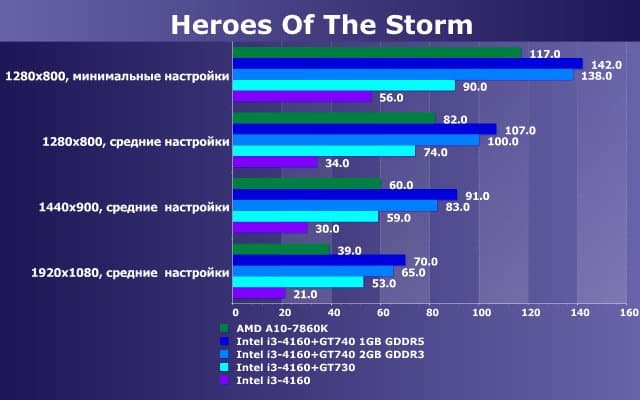 Итак, очевидно, что комфортно играть в Heroes of the Storm можно на всех исследуемых платформах, кроме варианта со встроенной графикой Intel Core i3-4160 (а с разрешением 1280×800 справится и она). Мы видим, что самую высокую производительность демонстрируют варианты Intel i3-4160 + GT 740 с GDDR5 или GDDR3 (в данном случае — почти без разницы), уверенно обходя платформу на базе AMD A10-7860K. Следует, однако, учесть, что для данной игры совершенно не требуются высокие значения FPS (60 или 100 — без разницы), а если посмотреть на стоимость платформ и разных вариантов комплектации, то платформа AMD A10-7860K может оказаться предпочтительнее, потому что дешевле. В то же время, у вариантов Intel Core i3-4160 с GT 740 есть приличный запас производительности, который можно «разменять» на повышение качества графики, тогда как в случае AMD A10-7860K, особенно в Full HD, этого себе позволить нельзя. Правда, визуально в этой игре не особенно видна разница даже между низкими и средними настройками качества. Вариант со встроенной графикой Intel Core i3-4160 тоже может подойти для игры в Heroes of the Storm, но только для минимальных настроек и разрешений не выше 1280×800.