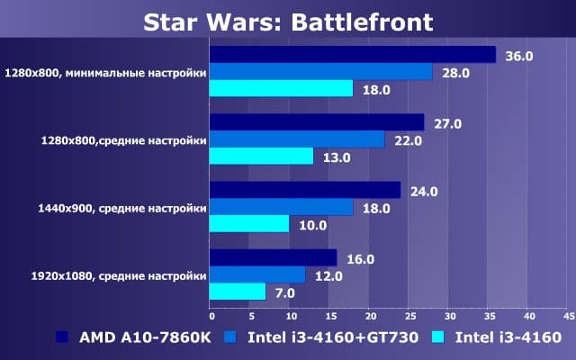 Тестирование показало, что платформа на базе AMD A10-7860K весьма серьезно выигрывает у связки Intel i3-4160 + Nvidia GT 730. Относительно комфортно играть в Star Wars: Battlefront получается только в разрешении не выше 1280×800 при среднем качестве, и только на платформе AMD A10-7860K (привлекательность данной платформы выше еще и потому, что она дешевле, чем связка i3-4160 + Nvidia GT 730). Переход на минимальное качество в 1280×800 позволяет играть и на i3-4160 + GT730, хотя до 30 fps эта связка так и не дотягивает.