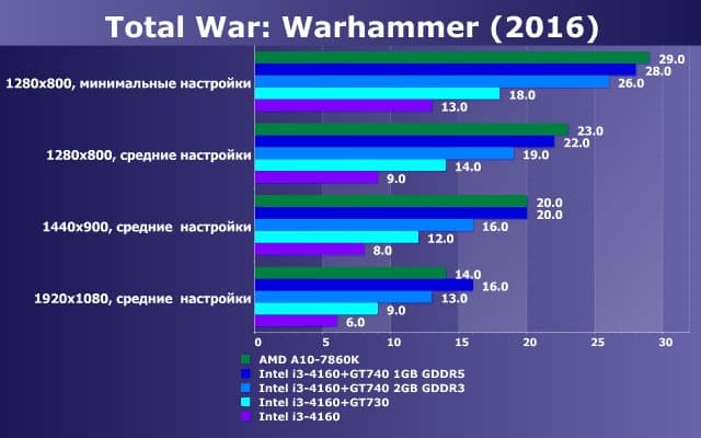 Итак, очевидно, что относительно комфортно играть в Total War: Warhammer (2016) можно только при минимальном качестве графики и в минимальных разрешениях на платформе на базе AMD A10-7860K или варианте Intel i3-4160 + GT 740 GDDR5 (на худой конец, Intel i3-4160 + GT 740 GDDR3), однако варианты на Intel дороже на 20%-40%, поэтому в сравнении снова выигрывает AMD A10-7860K.