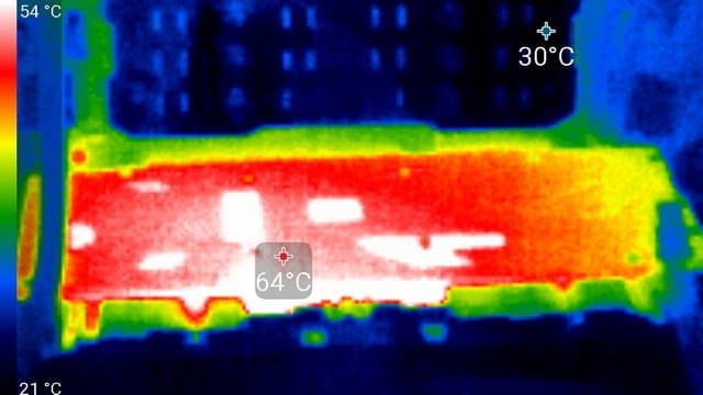 Максимальный нагрев 66 °С — на толстой пластине радиатора левее тепловых трубок. На фотографии меньше, так как снято с большего расстояния.