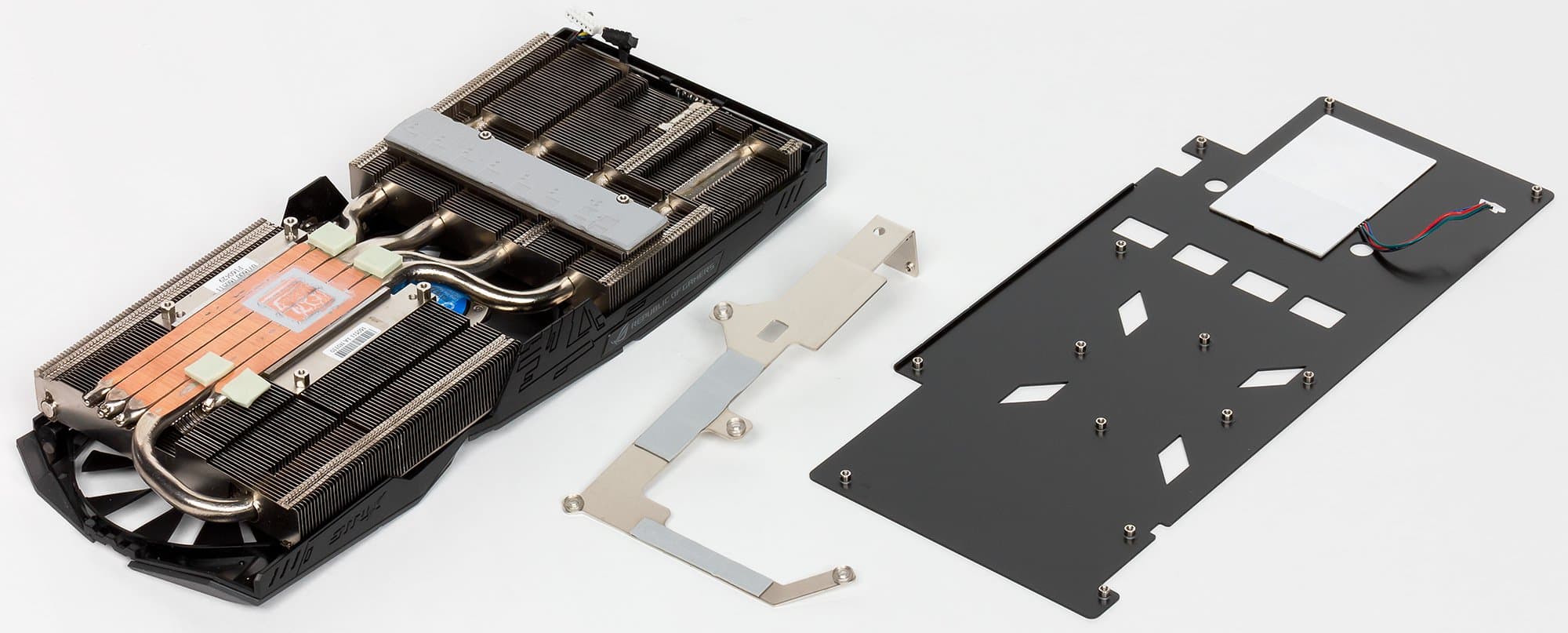 На торце в хвостовой части карты имеются два 4-контактных разъема питания для корпусных вентиляторов. Переключив их с материнской платы либо установив дополнительно, можно заставить их работать, увеличивая или уменьшая обороты в соответствии с нагревом GPU.