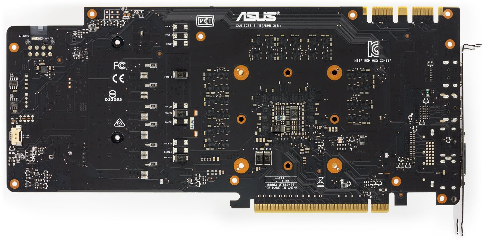 Печатная плата полностью спроектирована инженерами Asus. Сходство с референс-картой есть только в расположении микросхем памяти (это совершенно естественно).