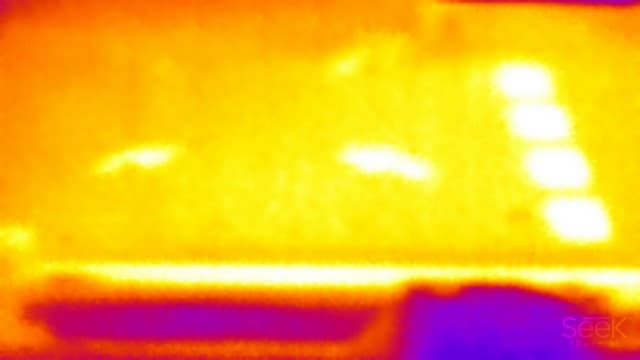 Hа тыльной стороне платы — пластина, мешающая локализовать максимально нагретую область. Но можно заметить, что самые светлые пятна на месте вырезов в пластине соответствуют расположению преобразователей.