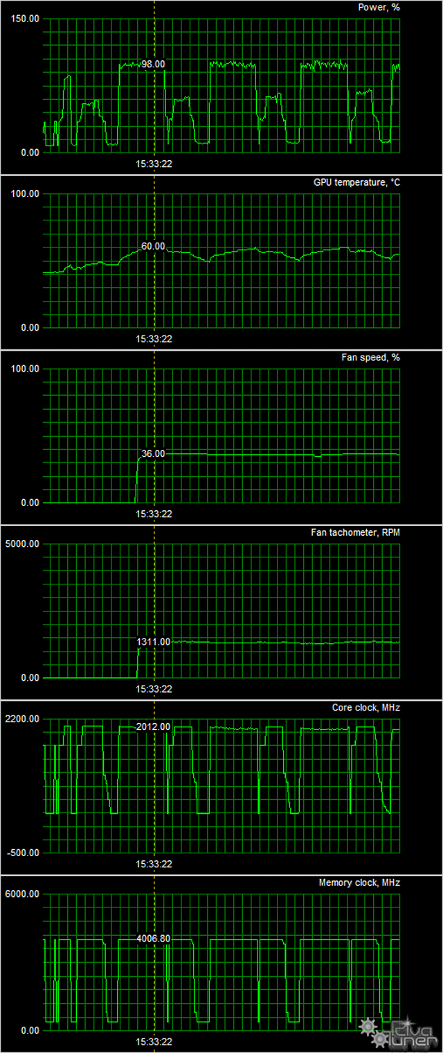 Также стоит акцентировать внимание на прилично повышенные частоты работы ускорителя относительно стандартных параметров референс-карты (на 11-13% выше по ядру, точнее сказать нельзя, потому что частота «плавает» в зависимости от приложений и режимов), что может дать прирост производительности примерно от 8% до 10% в зависимости от разрешения и режима работы.