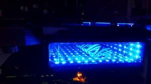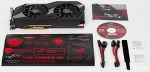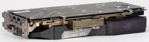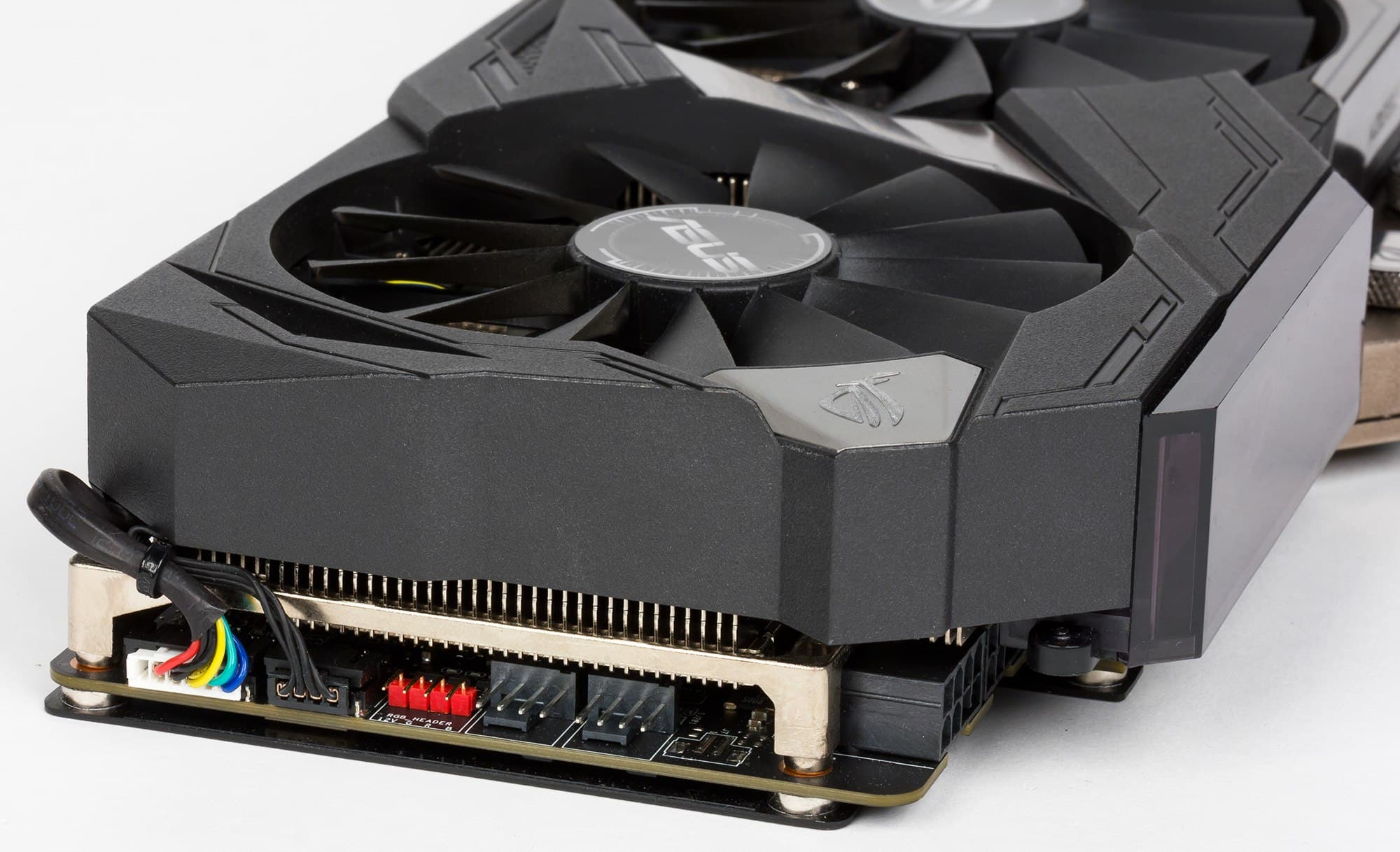 Hа торце в хвостовой части карты имеются два 4-контактных разъема питания для корпусных вентиляторов. Можно заставить подключенные к ним вентиляторы работать в соответствии с нагревом GPU, увеличивая или уменьшая обороты. Также имеется красный разъем для подключения особого моста SLI, поставляемого с материнскими платами премиум-класса из семейства ROG, для синхронизации световых эффектов на мосту с нагрузкой GPU.