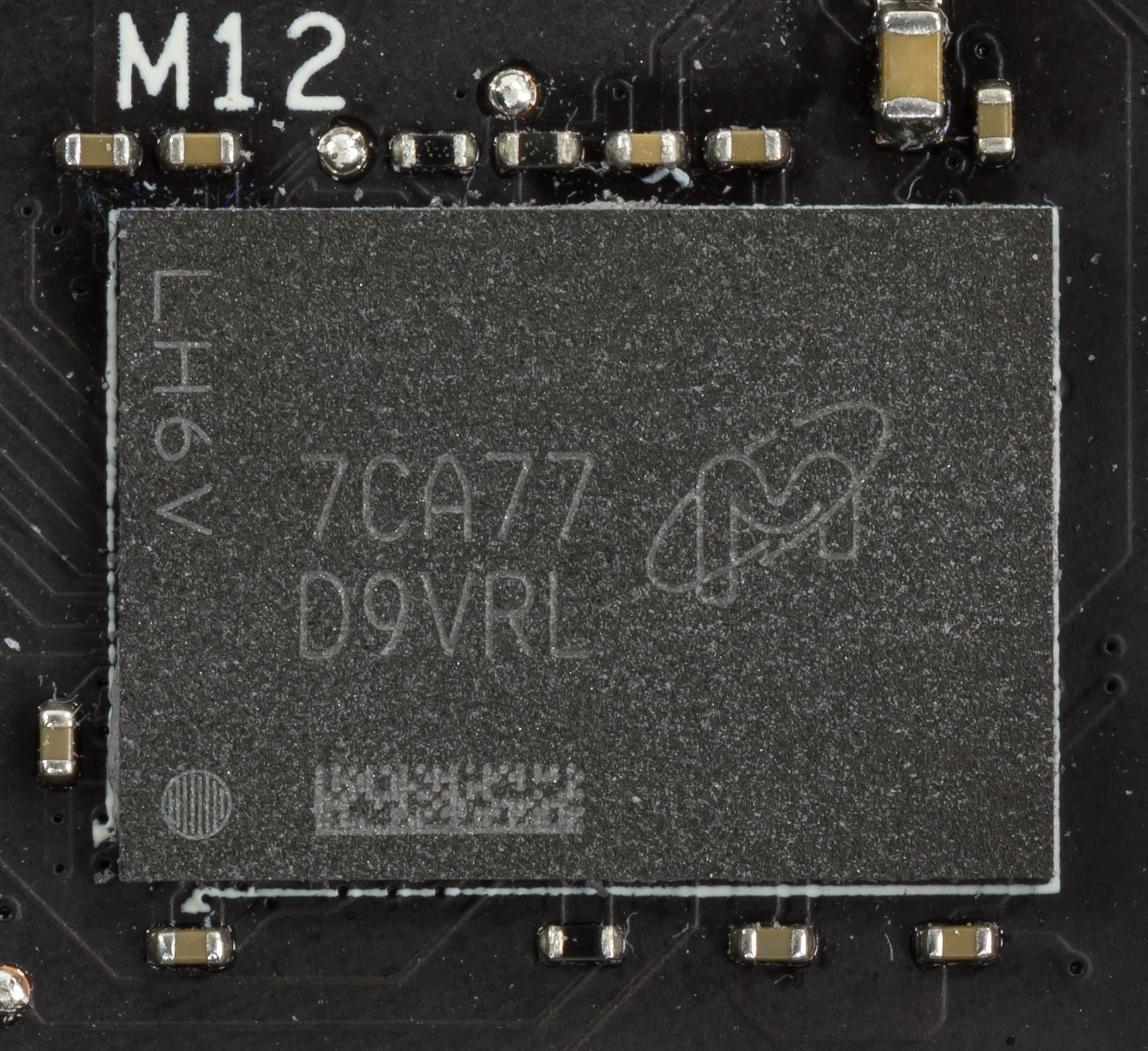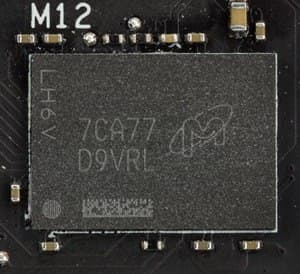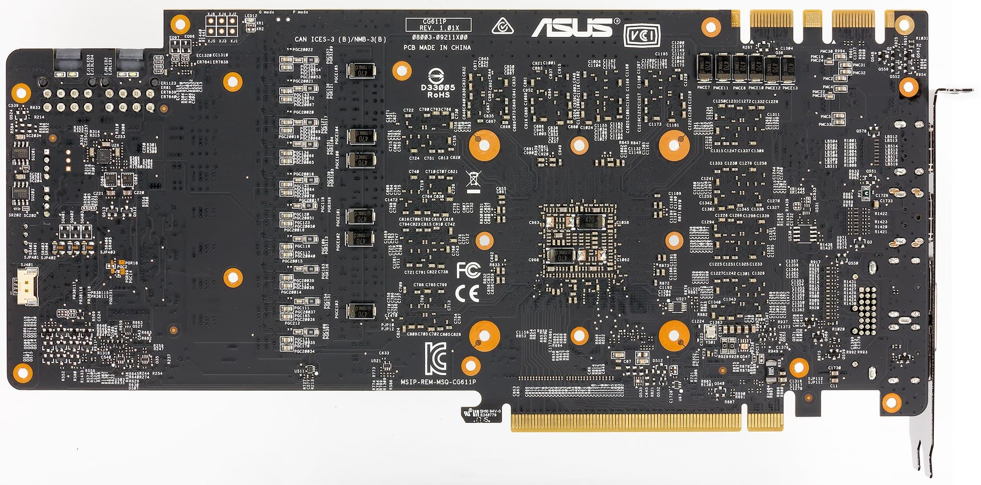 | Карта имеет 11 ГБ памяти GDDR5X SDRAM, размещенной в 11 микросхемах по 8 Гбит на лицевой стороне PCB. Микросхемы памяти Micron (GDDR5X) рассчитаны на номинальную частоту работы в 2800 (11200) МГц. | ![]() |