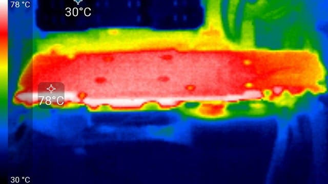 Максимальный нагрев 85 °С — на печатной плате в районе регуляторов напряжения.