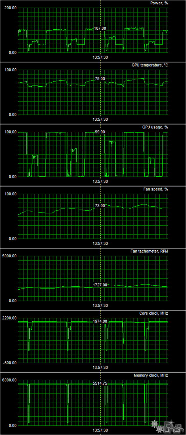 У данного ускорителя на 7,5% повышена частота работы относительно стандартных параметров референс-карты, что может обеспечить прирост производительности примерно в 7% в зависимости от разрешения и режима работы. Мы также протестировали карту с ЖСО, получив повышение частот на 10% относительно референсных значений (1700—2070/11500 МГц).