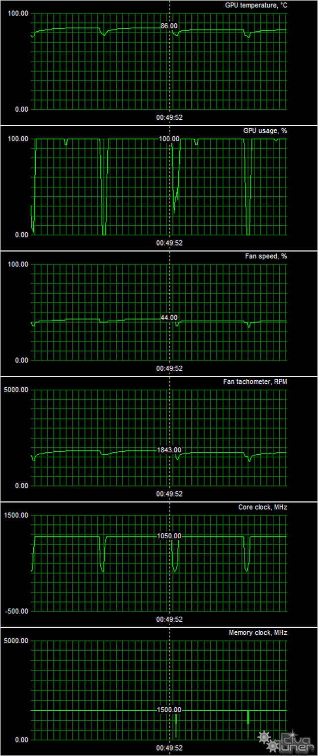 В режиме максимальной нагрузки в 3D температура достигала 82 °C, вентиляторы при этом раскручивались до 1843 оборотов в минуту, шум вырастал до 34 дБА — можно считать СО не слишком шумной.