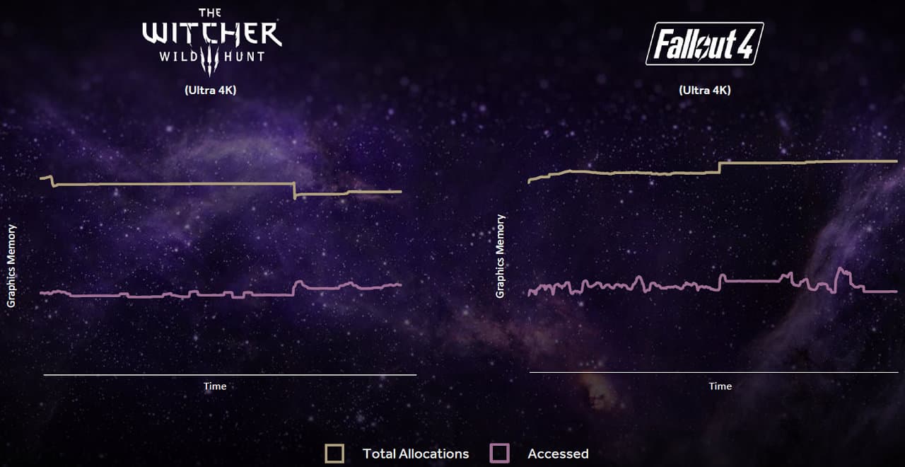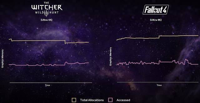 Не против роста объемов локальной видеопамяти и игровые разработчики, включая производителей игровых движков. Количество видеопамяти, занимаемой различными ресурсами во многих современных проектах, выросло до 8 ГБ и даже более. А некоторые игры и вовсе просто забивают весь имеющийся объем видеопамяти текстурами и буферами, вне зависимости от того, будут ли они использоваться в ближайшее время. Компания AMD недавно приводила статистику эффективности использования локальной видеопамяти в паре современных проектов: The Witcher Wild Hunt и Fallout 4. В разрешении 3840×2160 при ультра-настройках качества эти игры на деле запрашивают вдвое меньший объем данных, чем они заполнили локальной видеопамяти: