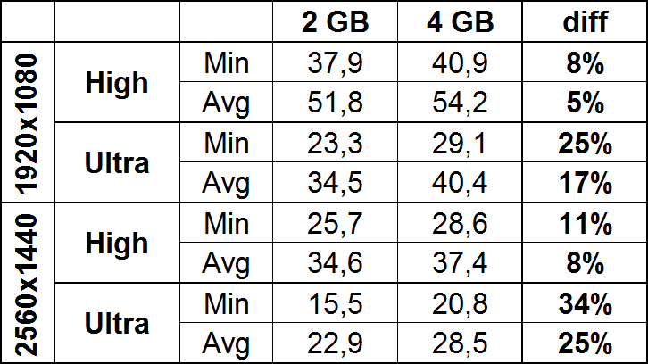 Даже при просто высоких настройках получается ощутимая разница в играбельности, когда 2 ГБ вариант падает до 23 FPS, а 4 ГБ видеокарта показывает вполне вменяемые 32 FPS минимальных. Не говоря уже об ультра-настройках, которые даются только видеокарте с вдвое большим объемом локальной видеопамяти: 36 FPS в среднем вполне играбельны, а вот 25 FPS с падениями до 17 FPS — уже нет.