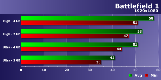 Как видите, даже в относительно низком Full HD-разрешении в игре Battlefield наблюдается явная разница в производительности между 2 ГБ и 4 ГБ вариантами не слишком мощных видеокарт, особенно при условии ультравысоких настроек. Если при высоких настройках разница не превысила 10%, и на деле отличить средние 58 FPS от 53 FPS вряд ли получится, то вот разницу между 51 и 41 FPS (также в среднем) вы точно почувствуете. Не говоря уже о разнице между минимальными показателями: 44 и 35 FPS.