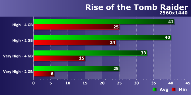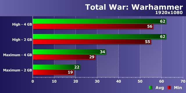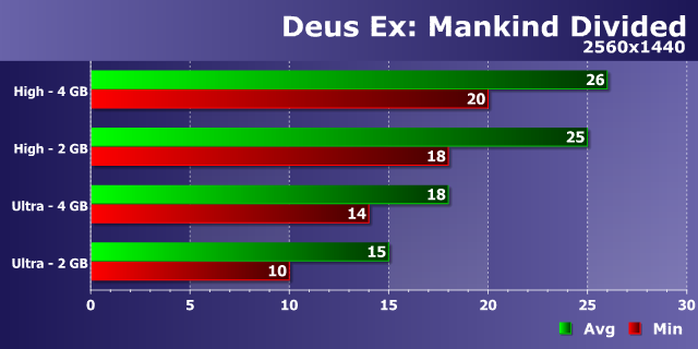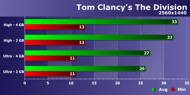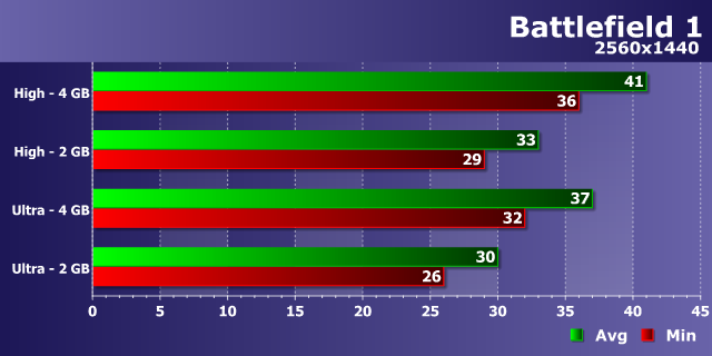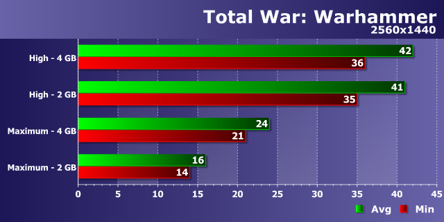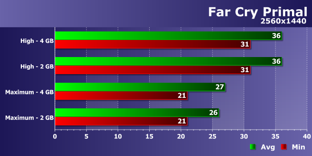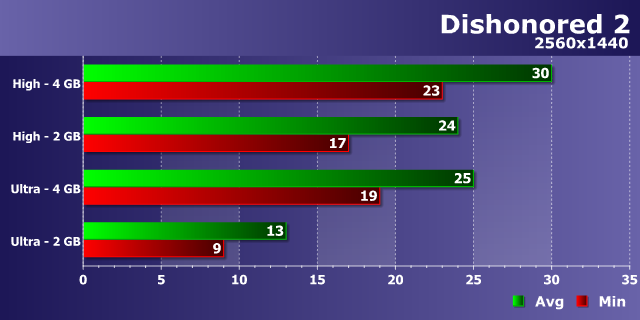 Как уже стало типичным для современных игр, мы видим слабое влияние возросшего разрешения рендеринга на разницу в производительности между видеокартами с 2 и 4 ГБ памяти при высоких настройках — в WQHD-разрешении мы видим те же 12-15%, что были в Full HD. И разница между 34-38 FPS и 30-34 FPS в этом режиме несущественна, хотя и присутствует.