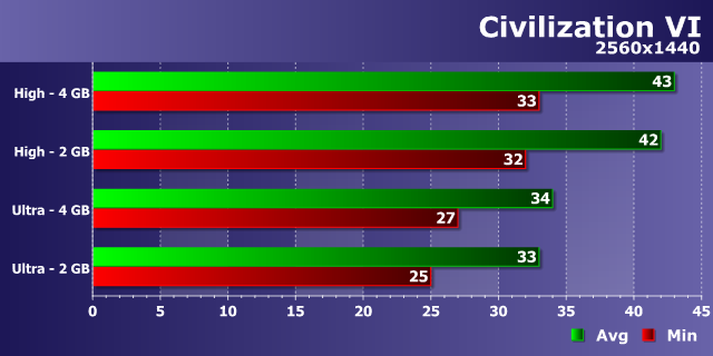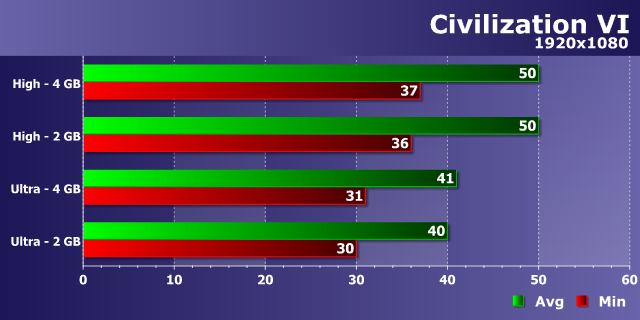 В отличие от Battlefield 1, шестая «Цивилизация» — наглядный пример игры, которой вполне достаточно пары гигабайт видеопамяти даже при условии установки ультра-качественных настроек. Как хорошо видно из диаграммы, никакой ощутимой разницы между 2 ГБ и 4 ГБ вариантами GeForce GTX 960 мы просто не обнаружили — разница получилась в пределах погрешности измерений.