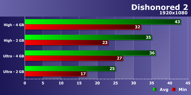 Просто ошеломительный контраст, по сравнению с предыдущими диаграммами! Немного удивительно, но именно в игре Dishonored 2, активно использующей стриминг текстур, мы увидели жесточайшую нехватку 2 ГБ видеопамяти. Цифры говорят сами за себя, производительность двух GeForce GTX 960, отличающихся исключительно объемом VRAM, в этой игре весьма сильно отличается, и особенно это касается минимального FPS.