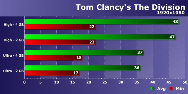 Конечно, мы ожидали, что какие-то игры нас удивят, но чтобы так... Такое впечатление, что движку The Division почти без разницы, сколько гигабайт видеопамяти (в разумных пределах, конечно!) имеет на борту видеокарта, он в любом случае занимается менеджментом памяти так необычно, что занимает всю имеющуюся память, и хоть и явно ухудшает качество текстур и прочих ресурсов при нехватке VRAM, но на скорость рендеринга это практически не влияет. Что хорошо с одной стороны — для игроков со слабыми видеоподсистемами, но странно с другой — а как при таком поведении видеокарты то тестировать?