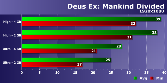 А вот в последней игре сериала Deus Ex мы видим куда более понятное и логичное поведение игрового движка. Если при просто высоких настройках и Full HD-разрешении две видеокарты GeForce GTX 960 с разным объемом видеопамяти показали схожую скорость рендеринга, так как ресурсы и буферы вошли в 2 ГБ VRAM, то при установке ультра-настроек разница стала уже ощутимой, особенно по минимальной частоте кадров: 17 FPS против 21 FPS. И хотя оба значения неиграбельны, это означает, что 4 ГБ вариант видеокарты даст поиграть с настройками между ультра и высокими с несколько большим комфортом.
