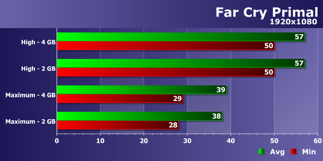 Такое впечатление, что игры с разным поведением в зависимости от объема видеопамяти специально чередуются (напомню, что мы рассматриваем их в алфавитном порядке): то игра требовательная к VRAM, то абсолютно нет. Вот и сейчас, после сверхтребовательной Deus Ex на очереди практически абсолютно индифферентная к объему локальной памяти игра Far Cry Primal. Как видите на диаграмме, никакой разницы в скорости нет, что с 2 ГБ видеопамяти, что с 4 ГБ — производительность одна и та же.