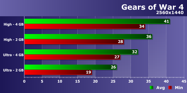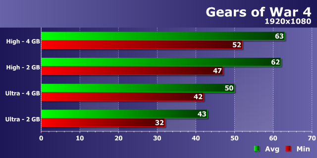 И снова как по заказу — игра, весьма требовательная к объему локальной видеопамяти. Gears of War 4 использует движок Unreal Engine 4 и стриминг текстур, и это сочетание явно желает занять и использовать довольно много видеопамяти. Если разница по средней скорости между 2 ГБ и 4 ГБ при Full HD-разрешении и высоких настройках оказалась не слишком велика, то минимальный FPS при меньшем количестве памяти заметно проседает — более, чем на 10%. Не говоря уже об ультра-настройках, которые наглядно показывают прирост производительности от большего объема видеопамяти — разница между 42 и 32 FPS для минимальных значений достаточно высока.