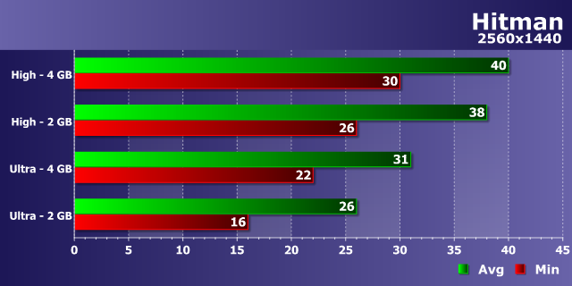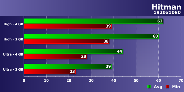В игре Hitman наблюдается типичное поведение для современных игровых проектов — если при высоких настройках разницы в производительности между 2 и 4 ГБ видеокартами практически нет, то при настройках ультра-качества она появляется, и довольно явная. Если 44 и 39 FPS в среднем друг от друга отличить будет непросто, то 28 FPS минимальных для 4 ГБ варианта ощутимо лучше 23 FPS у 2 ГБ платы. Так что комфорт при ультра-настройках даже в Full HD-разрешении будет много лучше при вдвое большем объеме видеопамяти.