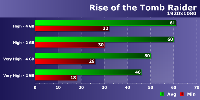 В последней игре из сериала Tomb Raider ситуация в целом похожа на то, что мы видели в Hitman. При просто высоких настройках и разрешении 1920×1080 в этой игре разницы между производительностью решений невысокой мощности с 2 и 4 ГБ видеопамяти практически нет, а вот при выборе очень высоких настроек качества, максимальных для этой игры, мы снова наблюдаем радикальные отличия в частоте кадров.
