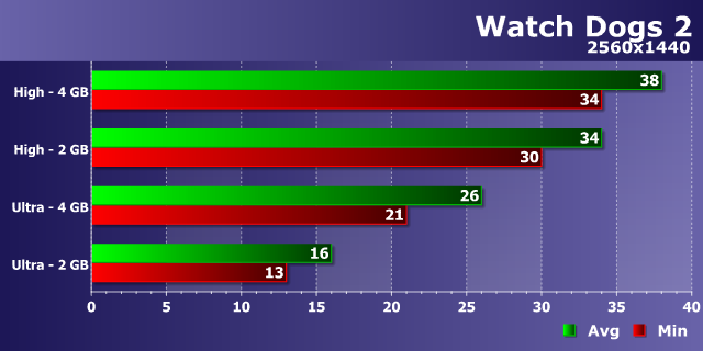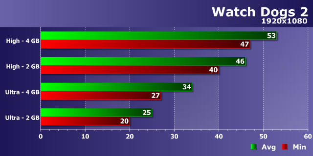 Одна из самых требовательных игр современности показала свою сущность — Watch Dogs 2 требует от графического процессора не только вычислительной мощи, но и приличного объема видеопамяти. Впрочем, в Full HD-разрешении при высоких настройках даже 2 ГБ вариант протестированной видеоплаты показал приемлемую производительность, отстав от 4 ГБ платы лишь на 15-20%, на удивление оставшись играбельным с 40-46 FPS.