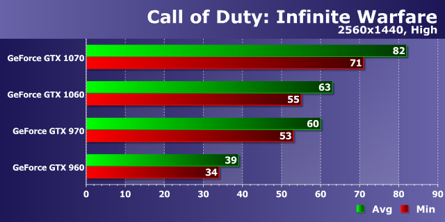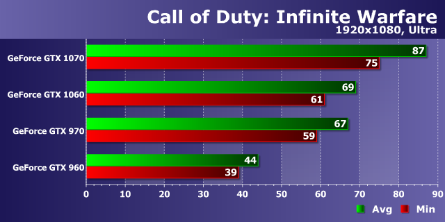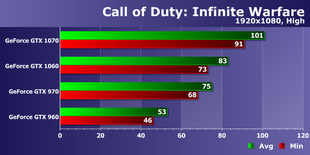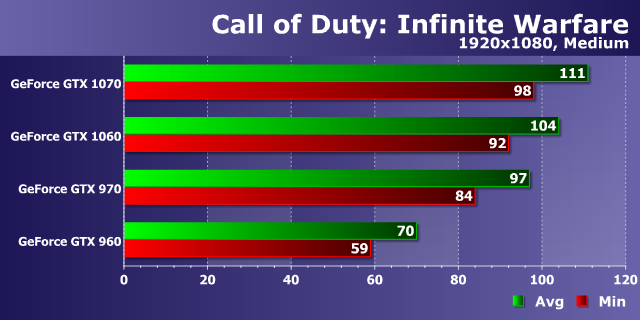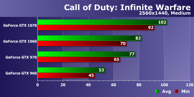 В самых простых условиях производительность игры была слегка ограничена скоростью центрального процессора, но видеокарты смогли раскрыть большую часть своих возможностей. Судя по диаграмме, оптимизация в Call of Duty: Infinite Warfare неплохая, и даже младшая модель нашего сравнения в виде решения предыдущего поколения (GeForce GTX 960) при средних графических настройках в самом распространенном разрешении без какого-либо труда справилась с обеспечением очень плавной смены кадров — при средней частоте кадров в 70 FPS ей не хватило совсем чуть-чуть минимальной частоты, чтобы добиться идеального уровня плавности.