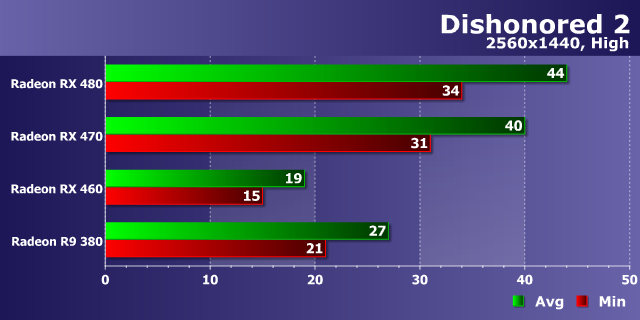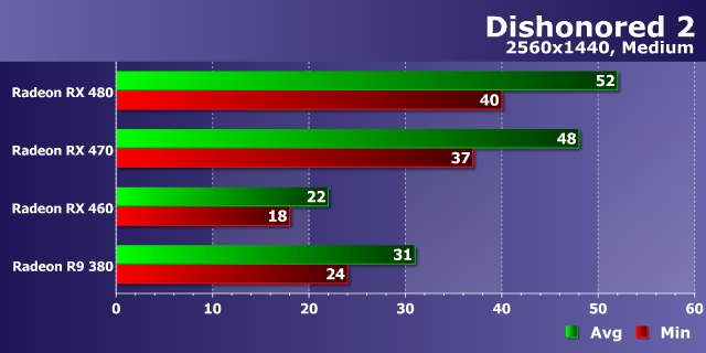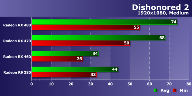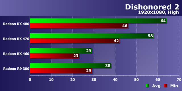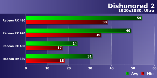 Radeon R9 380 из предыдущего поколения дает приемлемый комфорт при Full HD-разрешении и настройках между средними и высокими, а в более высоком разрешении не тянет даже средние настройки. Увы, но более свежая модель Radeon RX 460 вовсе не смогла показать приемлемую скорость смены кадров даже при средних настройках в Full HD, не обеспечив играбельности вообще. Так что любителям Dishonored 2, а по совместительству владельцам таких (и менее мощных) видеокарт придется настраивать игру на еще худшее качество или покупать новую видеокарту.