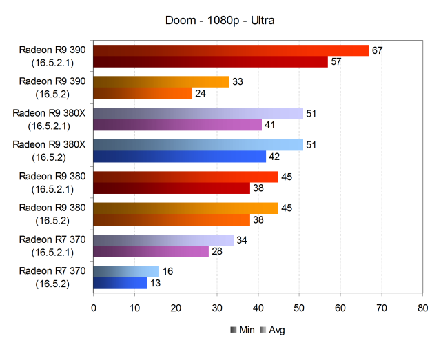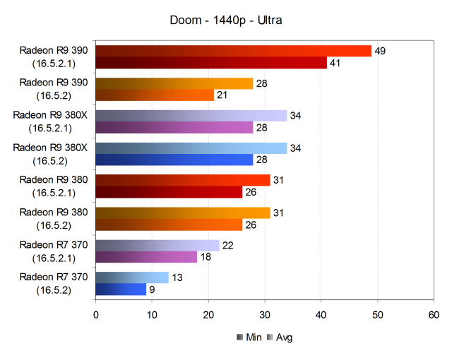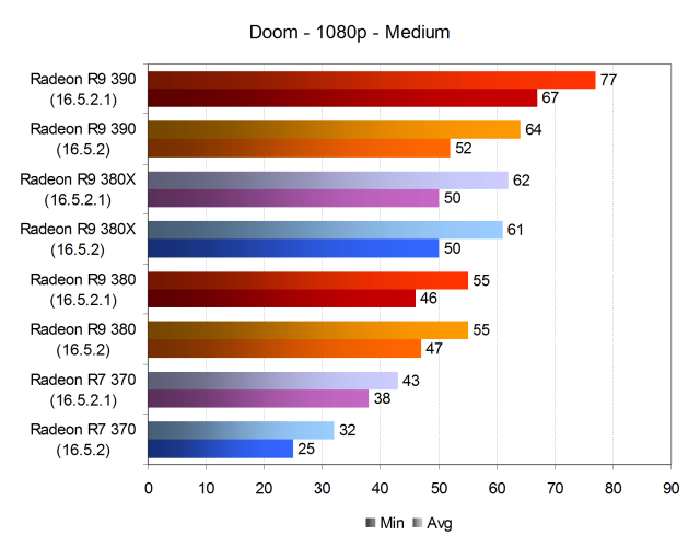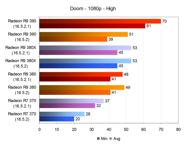 При высоких настройках качества частота кадров снизилась, но младшая модель Radeon R7 370 после обновления драйвера на исправленный показала хоть и минимально, но приемлемую для большинства игроков производительность — частота кадров не опускалась ниже 32 FPS при 37 средних кадрах в секунду. Да и решение верхнего уровня в виде Radeon R9 390 при высоких настройках в этот раз показало заметно более высокую скорость. Если в первом тесте Doom по причине ошибки в драйвере версии 16.5.2 производительность этой видеокарты была даже ниже, чем у R9 380X, то новый драйвер 16.5.2.1 принёс максимально комфортные средние 70 FPS без падений ниже отметки 60 FPS.