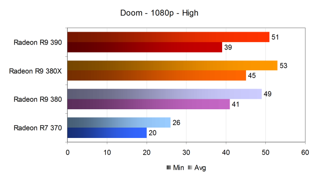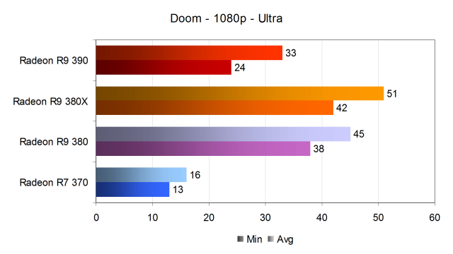 Тем более что разница по скорости между профилями High и Ultra в игре Doom для Radeon R9 380(X) оказалась не такой уж большой, хотя производительность игры всё же снизилась. Если старшая модель видеокарты Sapphire из-за программных недоработок не смогла показать приемлемой частоты кадров, то обе видеокарты среднего класса показали весьма неплохую производительность на играбельном уровне, хоть и дотянув до искомых 60 FPS. Просадки в частоте кадров до 38-42 FPS будут приемлемы для большинства пользователей, но могут помешать самым требовательным игрокам, которым придётся снижать настройки качества.