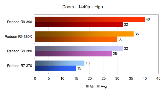 В игре Doom мы измеряли не только среднюю, но и минимальную частоту кадров, так как от неё зависит стабильность FPS и общий комфорт для игрока. По средней и минимальной частоте кадров из нашего теста вполне можно сделать выводы об общей плавности и комфортности этой игры. При средней частоте кадров в этой игре около 40-45 FPS и при падениях FPS не ниже 30 FPS, будет обеспечена приемлемая играбельность и плавность, но наиболее требовательным игрокам потребуется 60 FPS для достижения необходимого комфорта при игре.