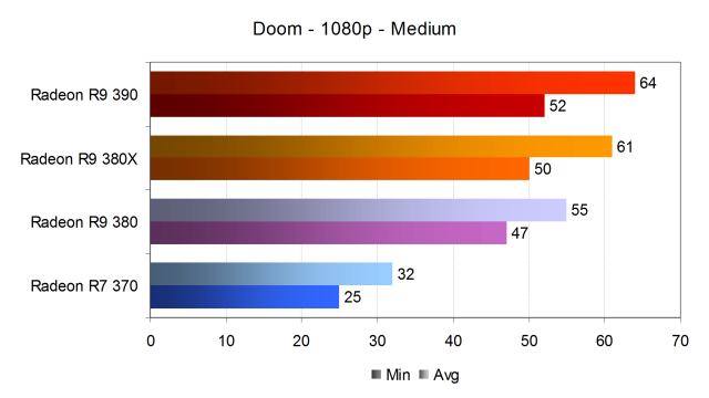 Мы не рассматривали настройки ниже среднего уровня, так как предполагали, что даже самая слабая видеокарта Radeon R7 370 должна была справиться со средними настройками в Full HD-разрешении. Традиционно для нашего сайта мы обязательно проверяем режим максимального (в данном случае — почти, так как настройки Nightmare можно выставить лишь на системах с более чем 4 ГБ видеопамяти) качества рендеринга, как самый востребованный вариант среди игровых энтузиастов. Рассмотрим сначала наиболее популярное Full HD-разрешение при средних настройках качества.