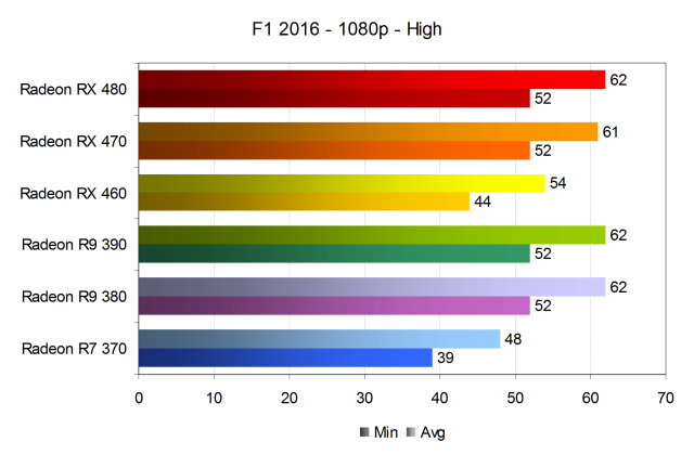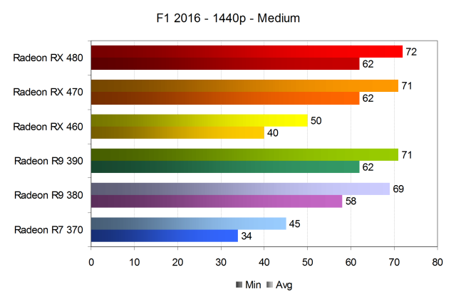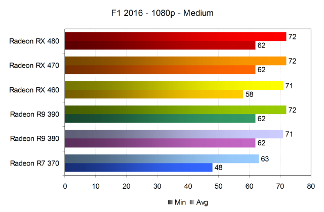 Как и ожидалось исходя из того, что F1 2016 слабо отличается от F1 2015, даже младшая модель предыдущего поколения Radeon R7 370 в условиях средних графических настройках и самого распространенного разрешения показала более чем приемлемую скорость рендеринга. Более того — абсолютно все видеокарты нашего сравнения в самых простых условиях смогли обеспечить в игре F1 2016 комфортную частоту кадров, при котором минимальное значение в большинстве случаев не опускалось ниже 60 FPS, чего достаточно для самого требовательного пользователя.