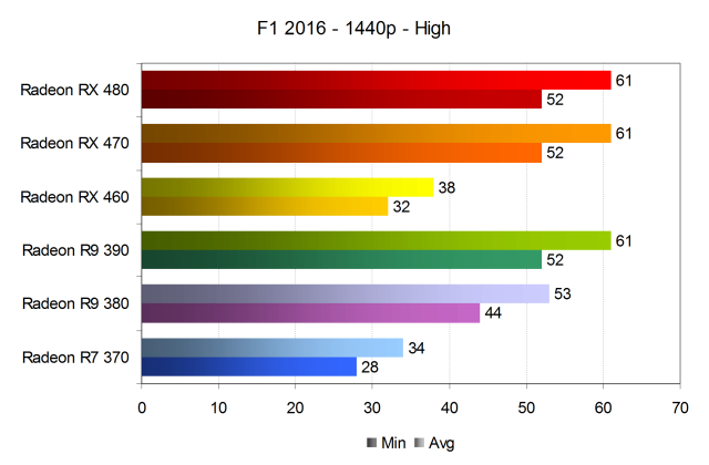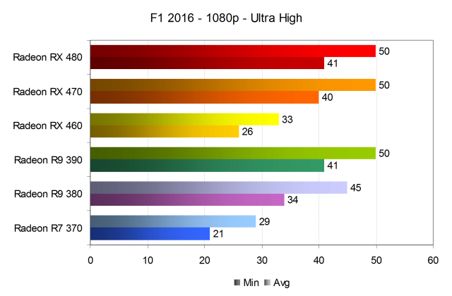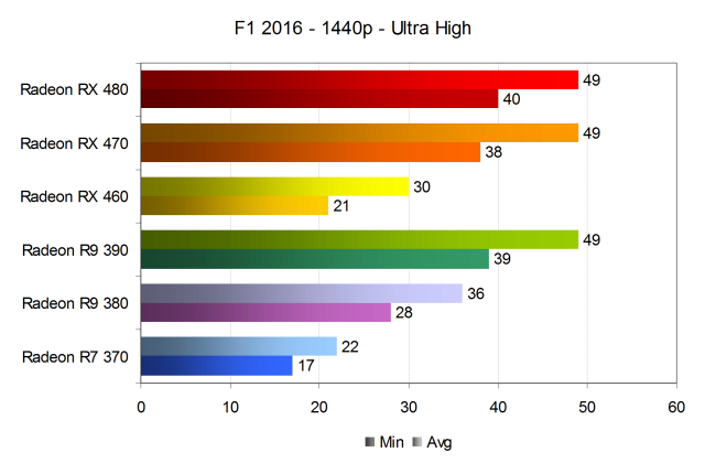 При установке профиля ультра-высоких настроек качества в WQHD-разрешении, даже «старшая тройка» видеокарт Radeon (RX 470 и 480, а также R9 390), справляется с задачей обеспечения комфорта уже со скрипом, обеспечивая 49 кадров в секунду в среднем при минимальном значении в 38-40 FPS. Хотя этого достаточно для комфортной игры, но не при идеальных 60 FPS, на которые явно способны мощные GPU. В F1 2016 их «душит» движок игры, устаревший API DirectX 11, и видеодрайвер, которые не дают графическим процессорам показать все их возможности.