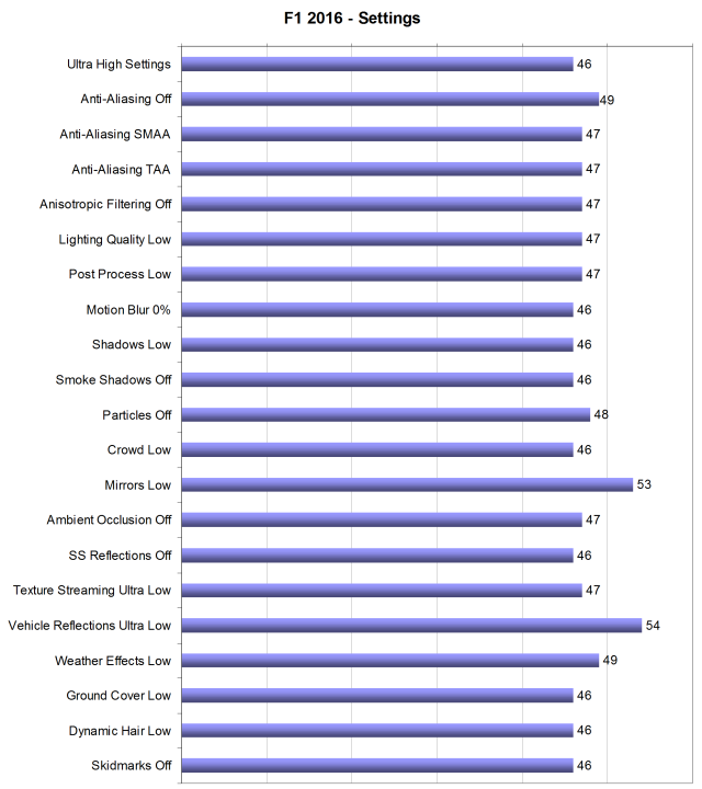 Самым требовательным к мощности графических процессоров параметром в игре F1 2016 является Vehicle Reflections, отвечающий за качество реалистичных отражений на гоночных автомобилях, которые хоть и важны с точки зрения визуальной составляющей, но вовсе не обязательны для успешной игры. В нашем тесте снижение параметра до значения Low привело к росту частоты кадров от 46 до 54 FPS, так что владельцам слабых систем следует обратить на эту настройку самое пристальное внимание.