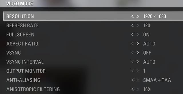В подменю Video Mode можно изменить разрешение экрана, частоту обновления, соотношение сторон, параметры отображения (полноэкранный или оконный режим), включить или выключить вертикальную синхронизацию, выбрать уровень полноэкранного сглаживания (см. далее) и анизотропной фильтрации.