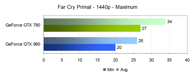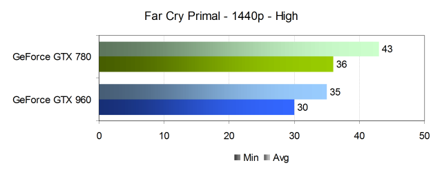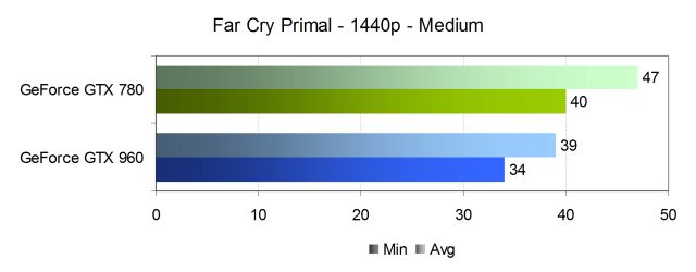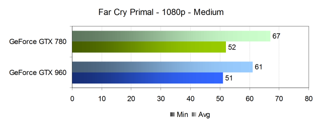 Вторая видеокарта из нашего сравнения — GeForce GTX 960, относящаяся к среднеценовому диапазону, в игре Far Cry Primal даёт приемлемую частоту кадров также при любых настройках в Full HD-разрешении, но при более высоком разрешении монитора обеспечивает более 30 кадров в секунду при отсутствии неприятных просадок ниже этого значения лишь при высоком качестве рендеринга. А для максимального профиля при разрешении 2560×1440 понадобится уже более мощный GPU.